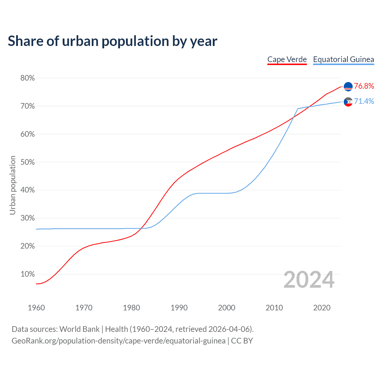 From 2004 to 2024, the share of urban population changed from 57.1% to 76.8% in Cape Verde and from 40.9% to 71.4% in Equatorial Guinea.