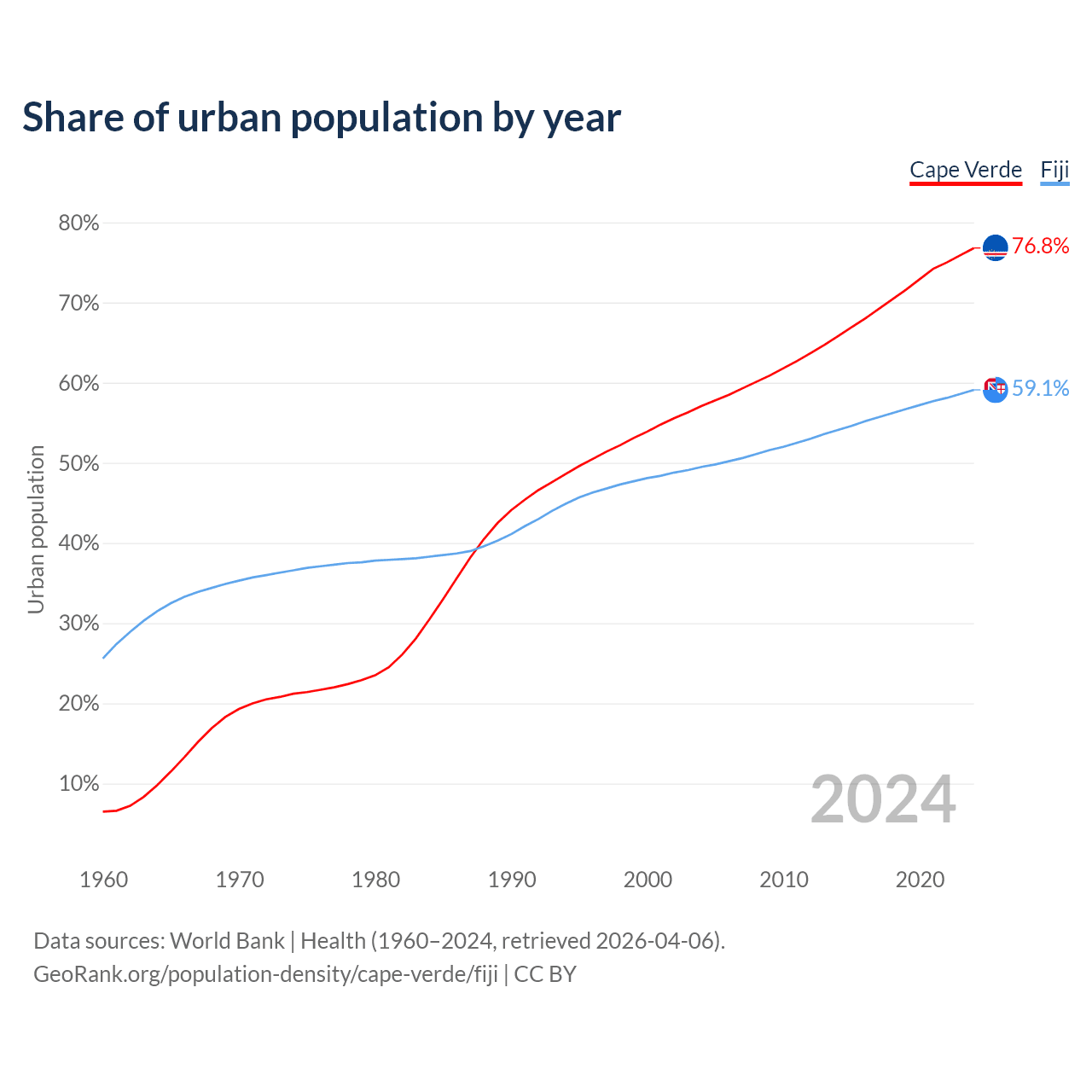 From 2004 to 2024, the share of urban population changed from 57.1% to 76.8% in Cape Verde and from 49.5% to 59.1% in Fiji.