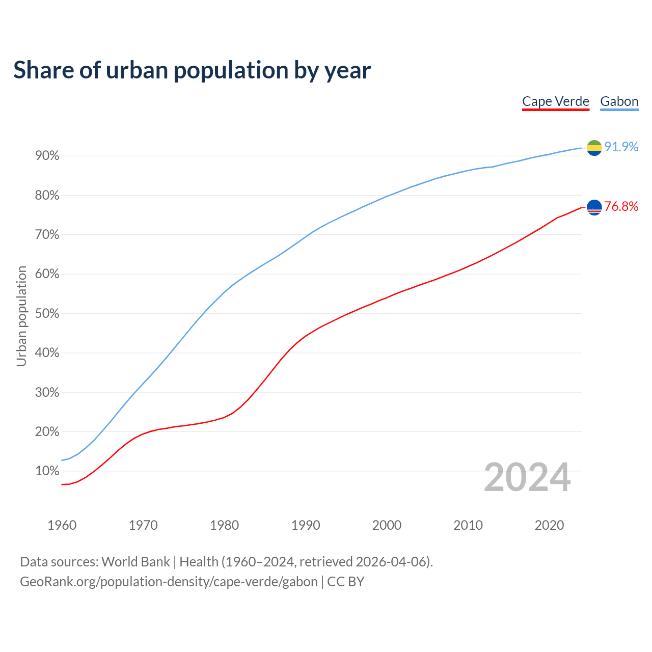 From 2004 to 2024, the share of urban population changed from 57.1% to 76.8% in Cape Verde and from 82.7% to 91.9% in Gabon.