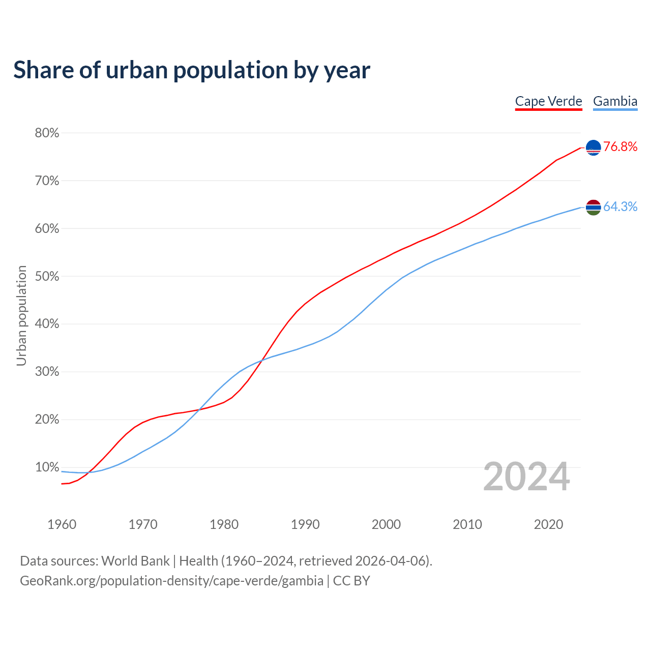 From 2004 to 2024, the share of urban population changed from 57.1% to 76.8% in Cape Verde and from 51.5% to 64.3% in the Gambia.