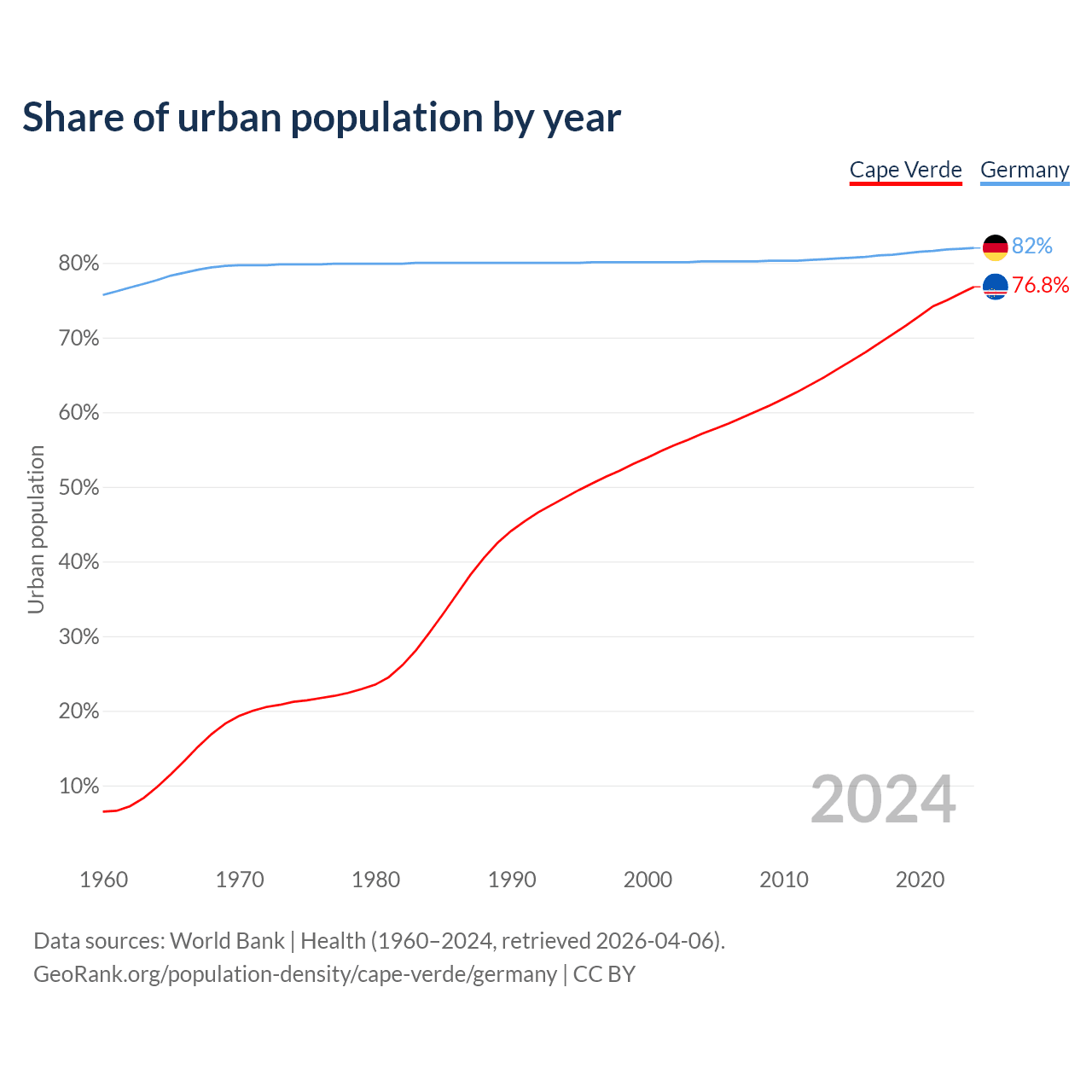 From 2004 to 2024, the share of urban population changed from 57.1% to 76.8% in Cape Verde and from 80.2% to 82% in Germany.