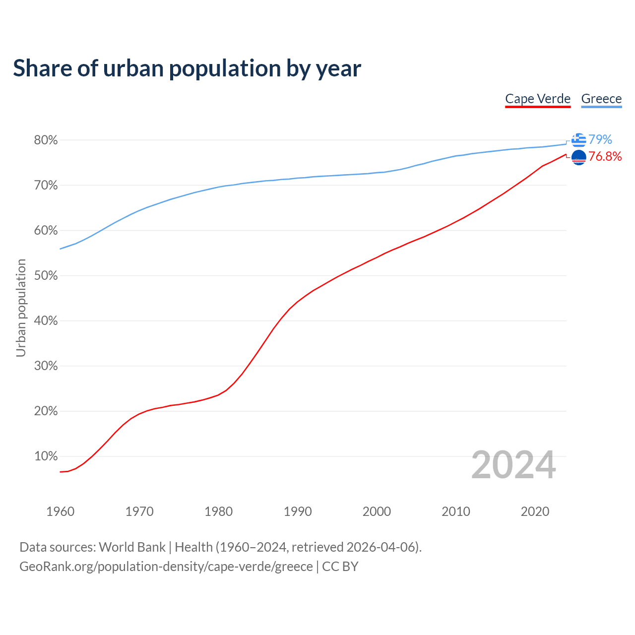 From 2004 to 2024, the share of urban population changed from 57.1% to 76.8% in Cape Verde and from 73.8% to 79% in Greece.