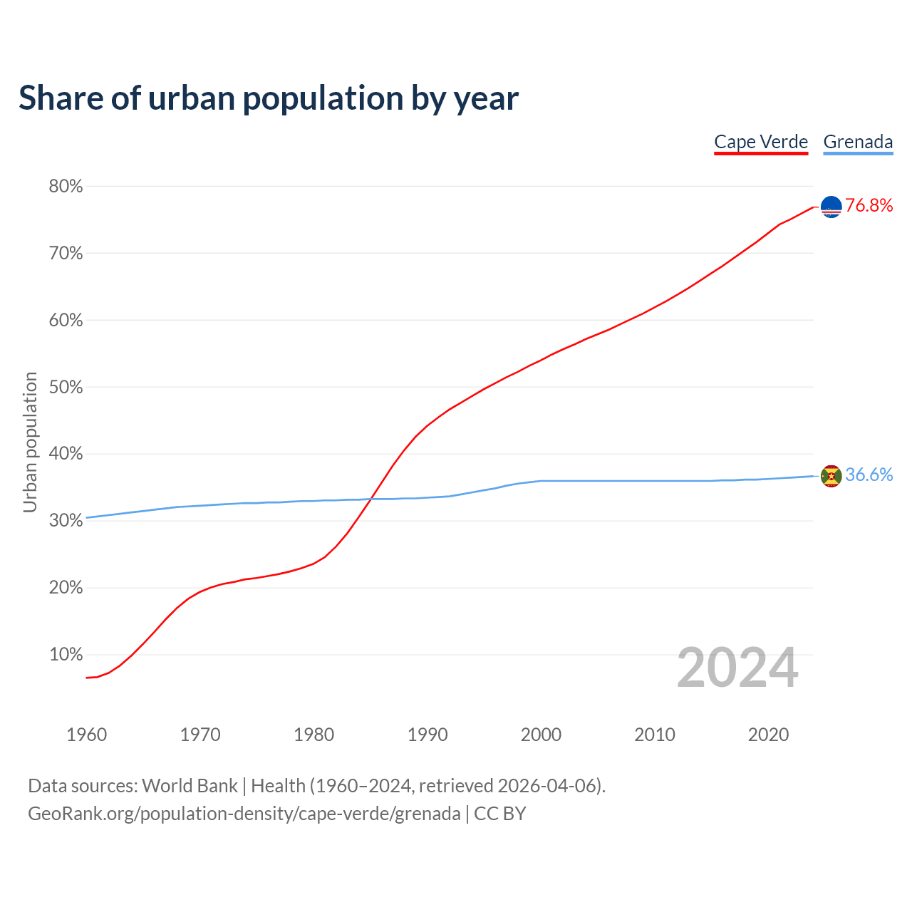 From 2004 to 2024, the share of urban population changed from 57.1% to 76.8% in Cape Verde and from 35.9% to 36.6% in Grenada.