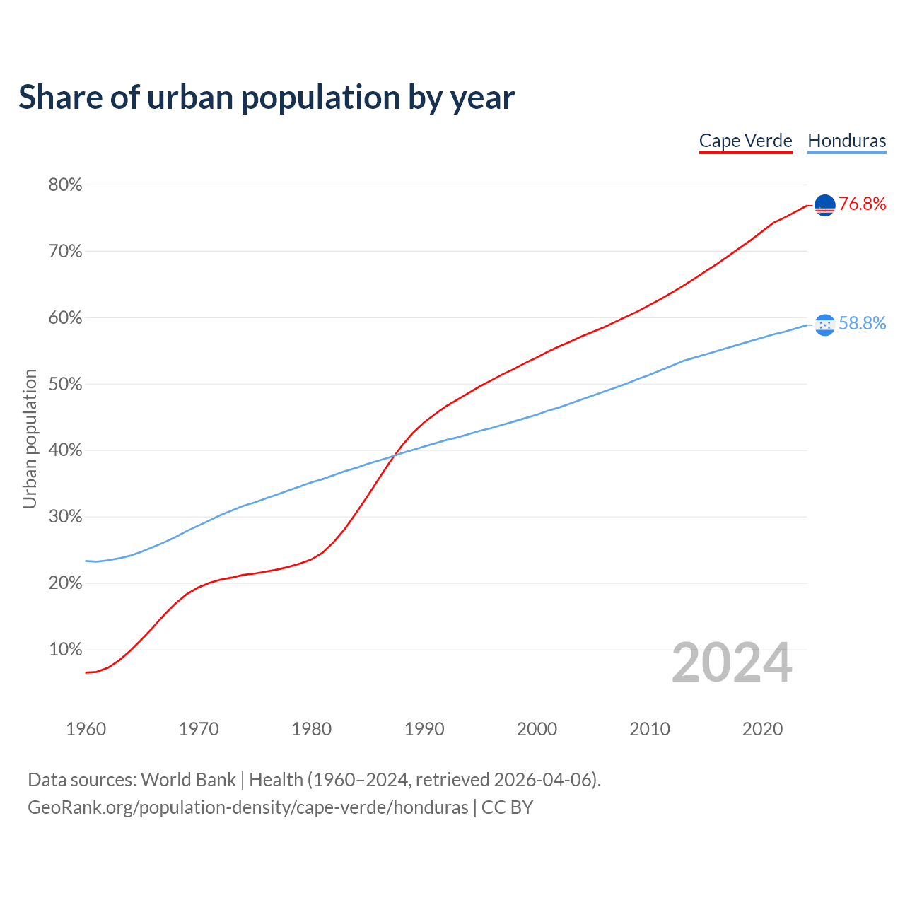 From 2004 to 2024, the share of urban population changed from 57.1% to 76.8% in Cape Verde and from 47.6% to 58.8% in Honduras.