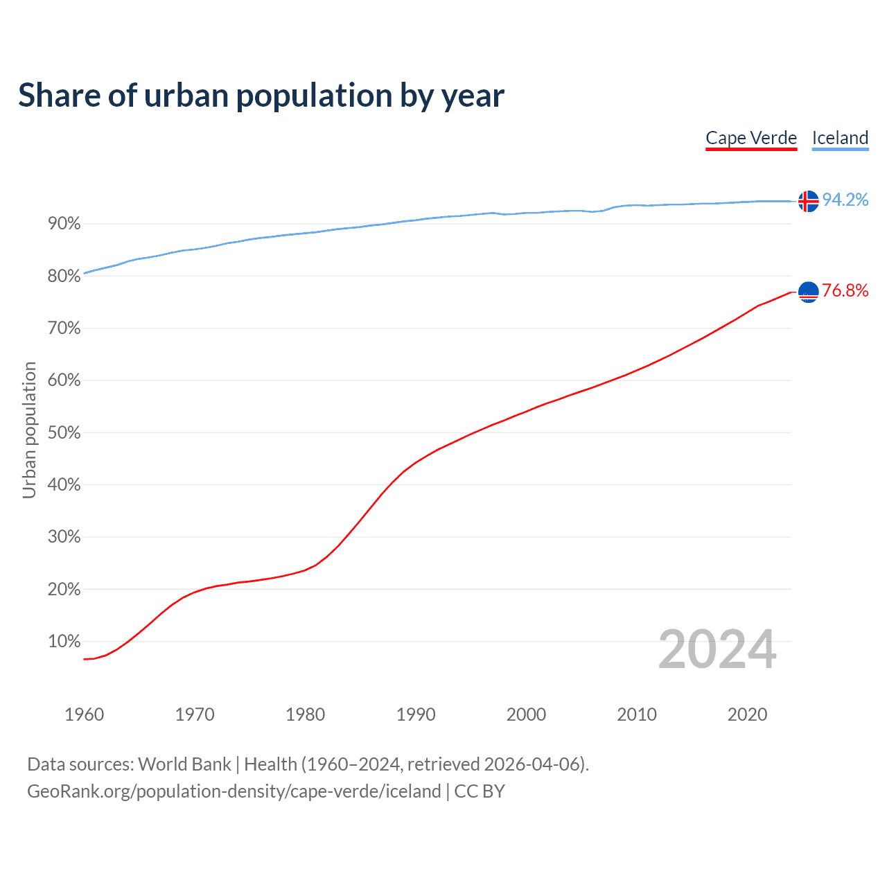 From 2004 to 2024, the share of urban population changed from 57.1% to 76.8% in Cape Verde and from 92.4% to 94.2% in Iceland.