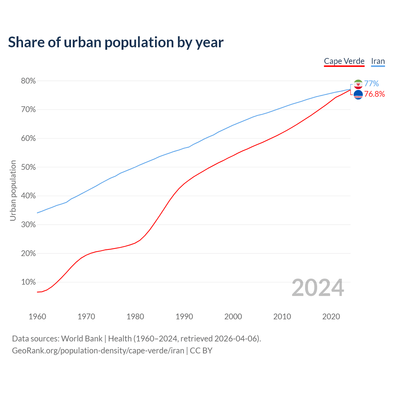 From 2004 to 2024, the share of urban population changed from 57.1% to 76.8% in Cape Verde and from 67.3% to 77% in Iran.