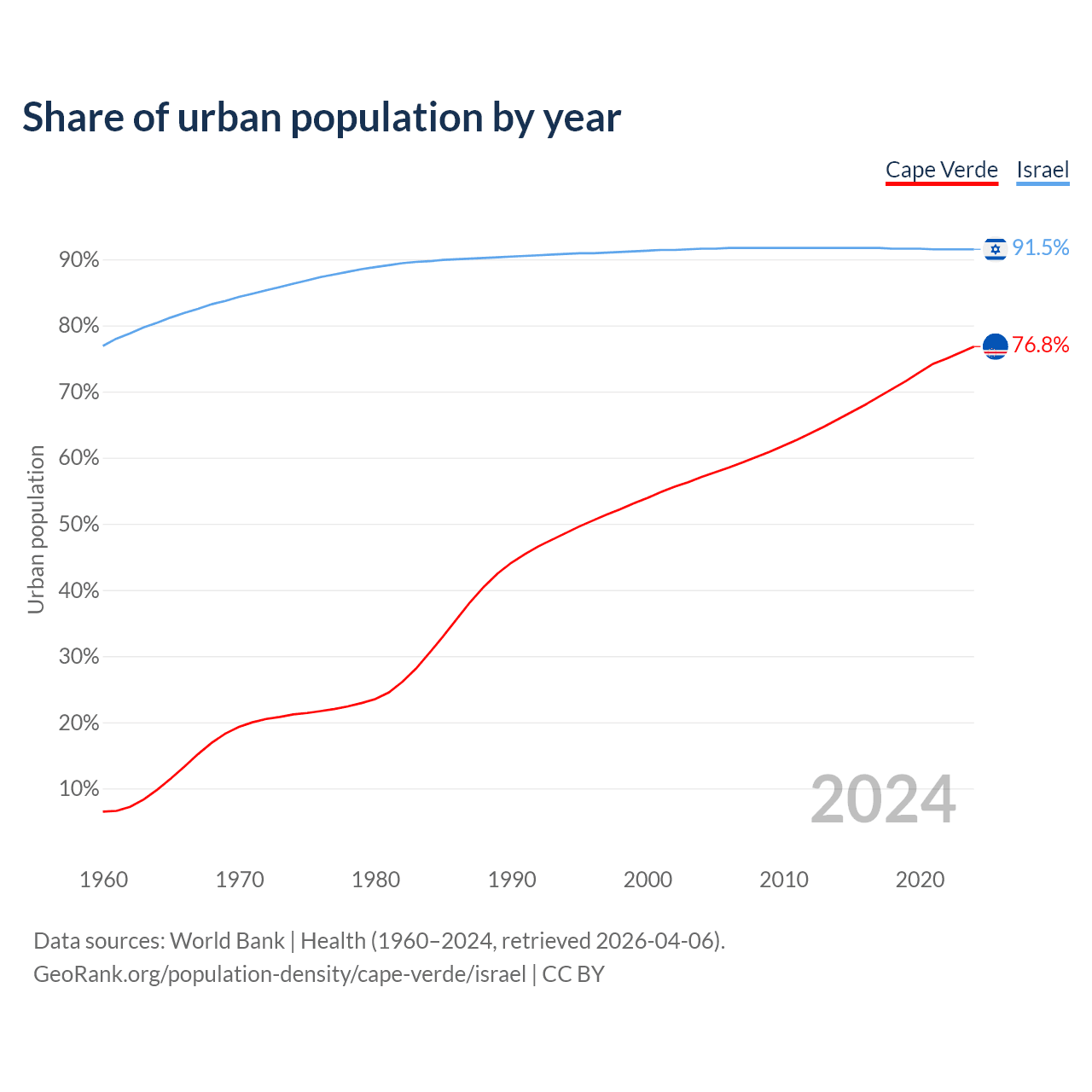 From 2004 to 2024, the share of urban population changed from 57.1% to 76.8% in Cape Verde and from 91.6% to 91.5% in Israel.