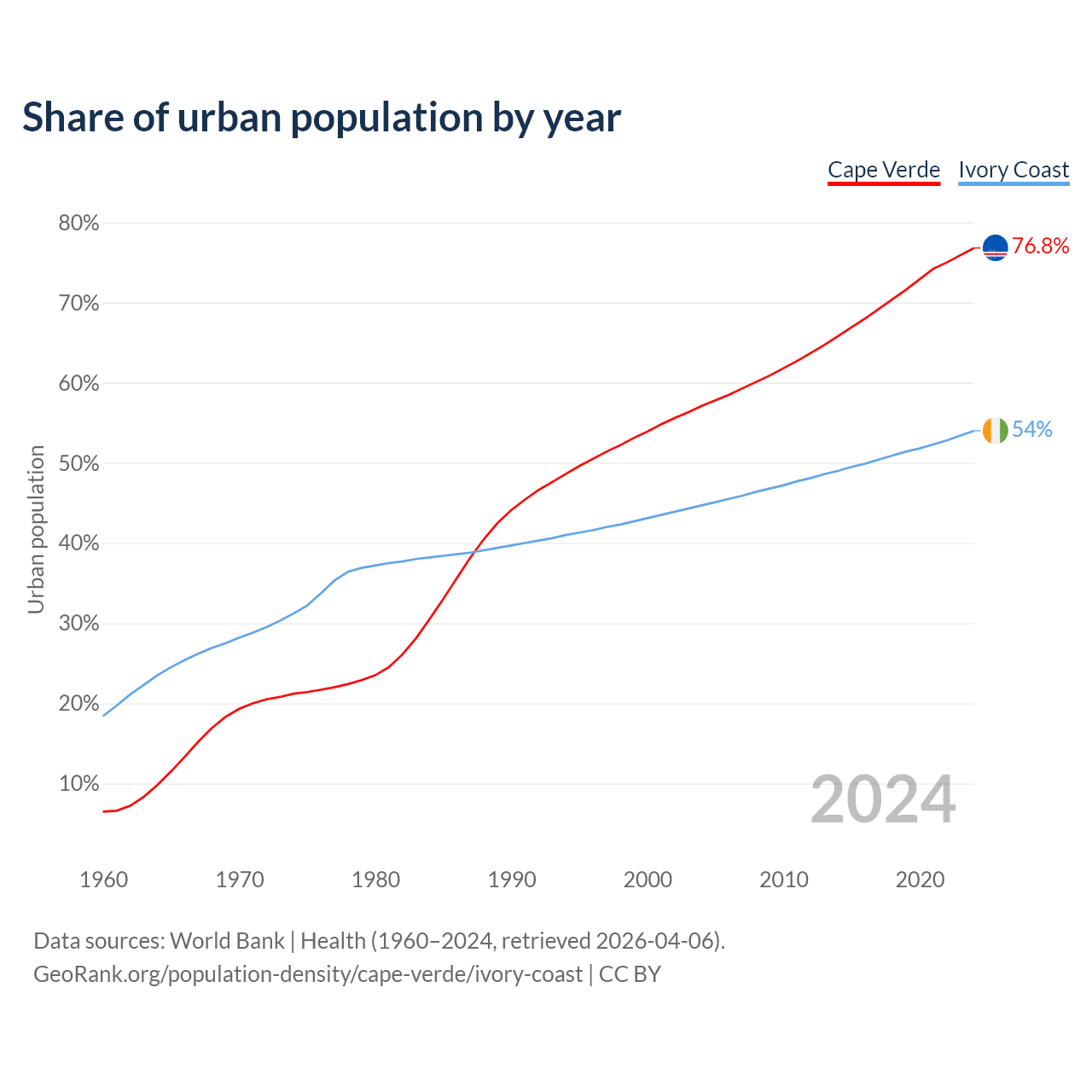 From 2004 to 2024, the share of urban population changed from 57.1% to 76.8% in Cape Verde and from 44.7% to 54% in Ivory Coast.