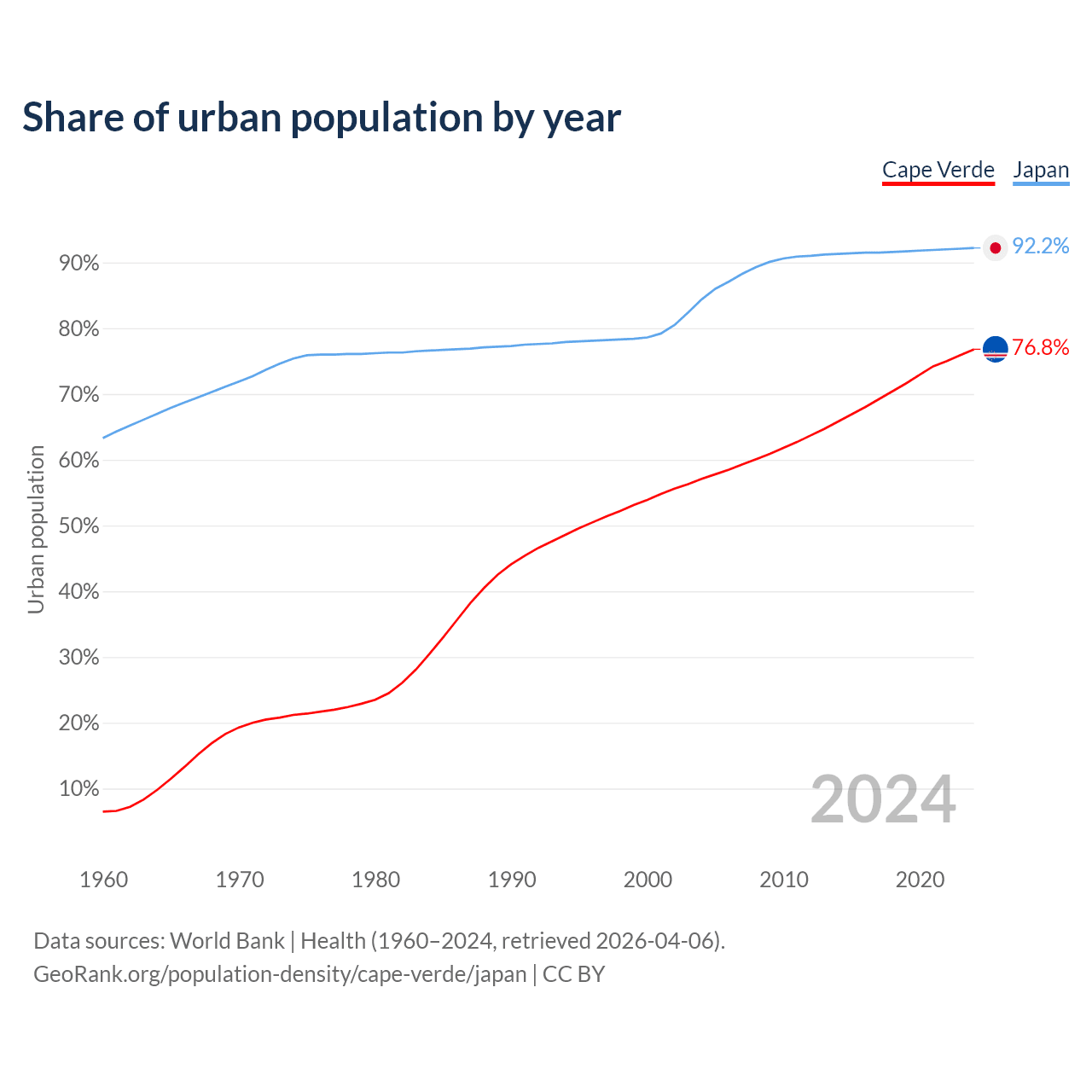 From 2004 to 2024, the share of urban population changed from 57.1% to 76.8% in Cape Verde and from 84.4% to 92.2% in Japan.