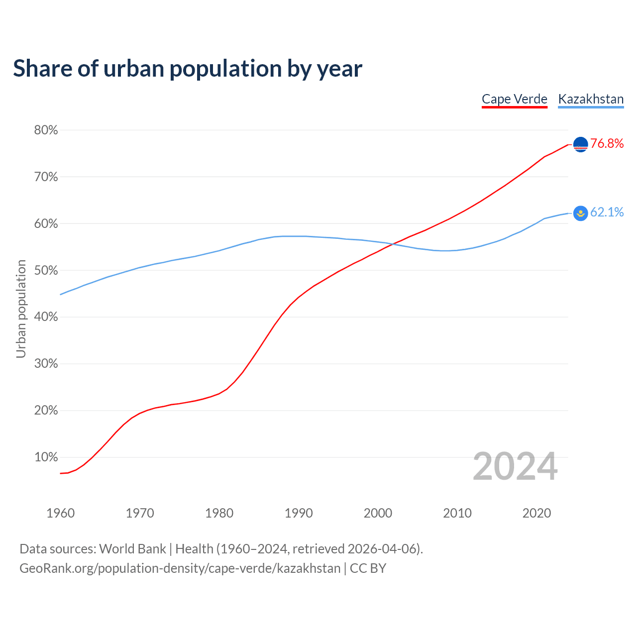 From 2004 to 2024, the share of urban population changed from 57.1% to 76.8% in Cape Verde and from 54.9% to 62.1% in Kazakhstan.