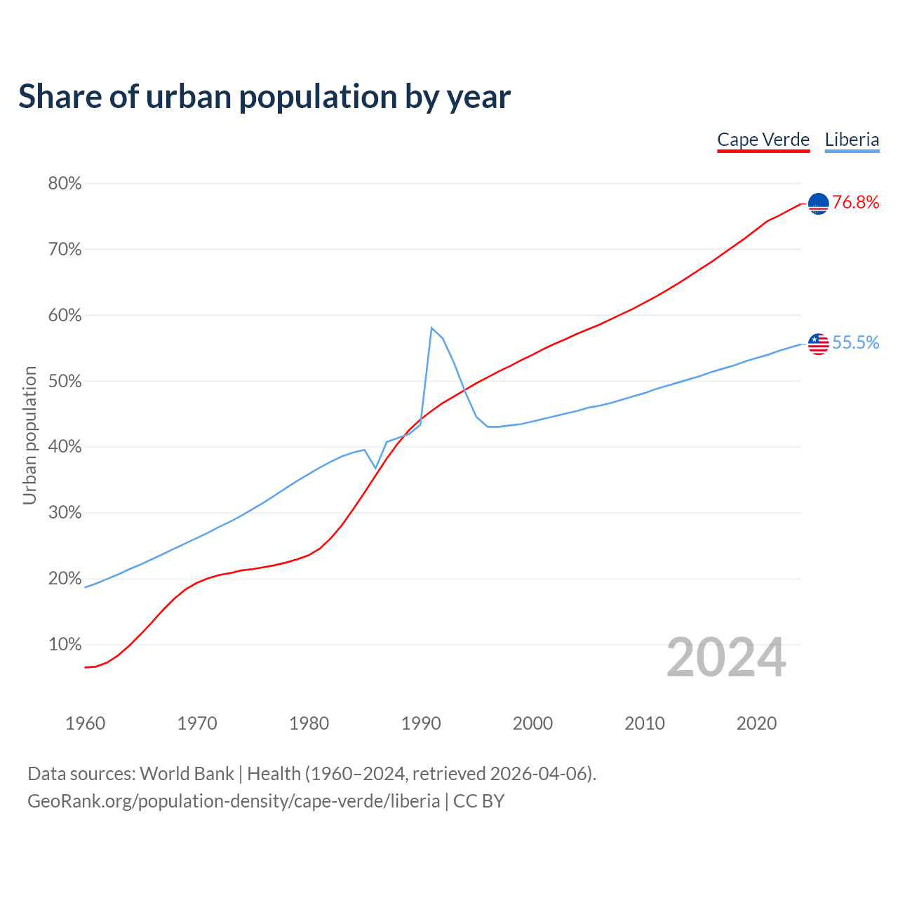 From 2004 to 2024, the share of urban population changed from 57.1% to 76.8% in Cape Verde and from 45.4% to 55.5% in Liberia.