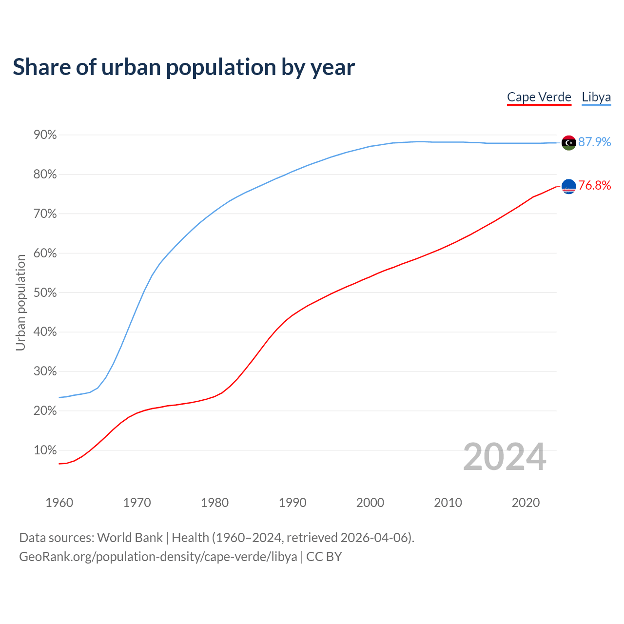 From 2004 to 2024, the share of urban population changed from 57.1% to 76.8% in Cape Verde and from 88% to 87.9% in Libya.