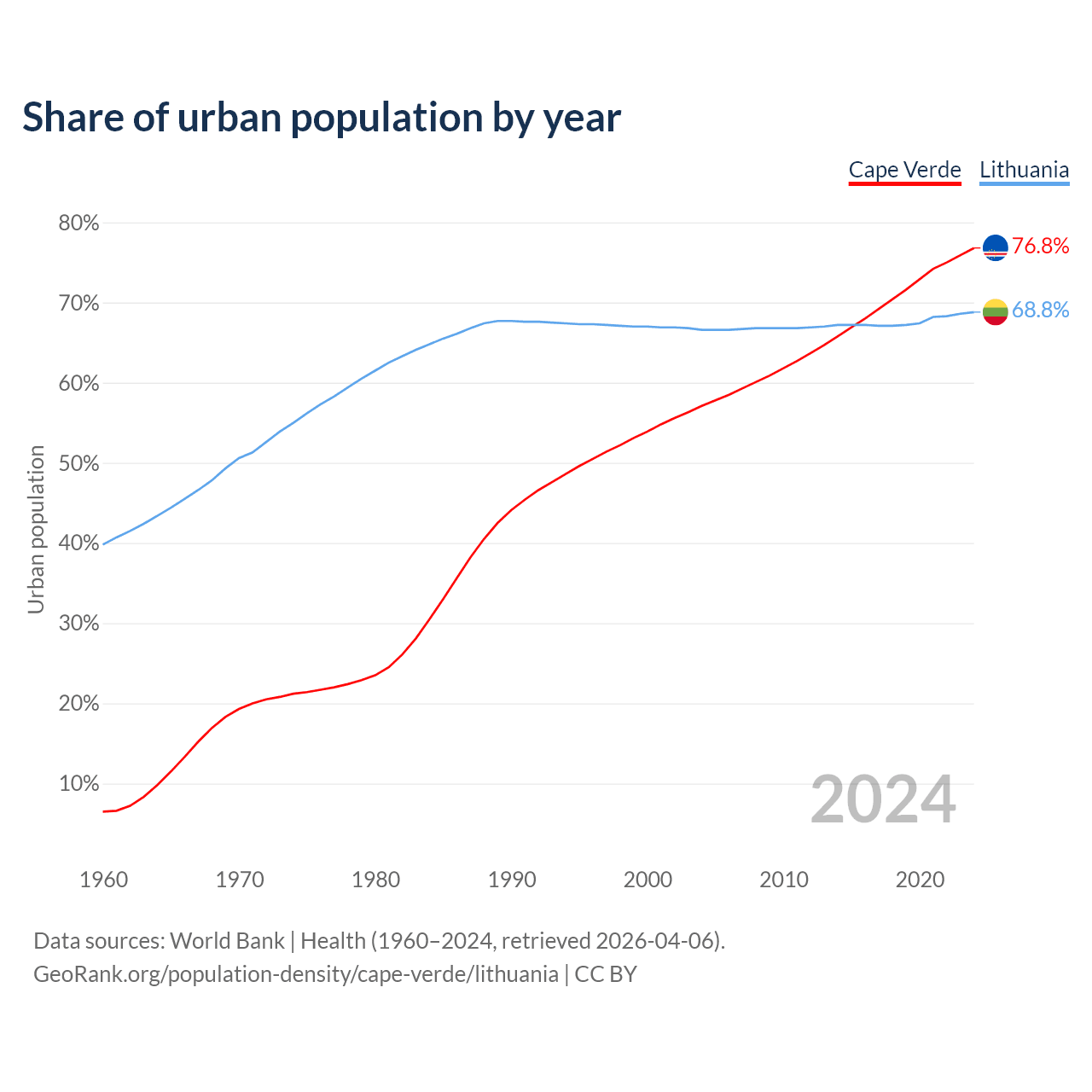 From 2004 to 2024, the share of urban population changed from 57.1% to 76.8% in Cape Verde and from 66.6% to 68.8% in Lithuania.