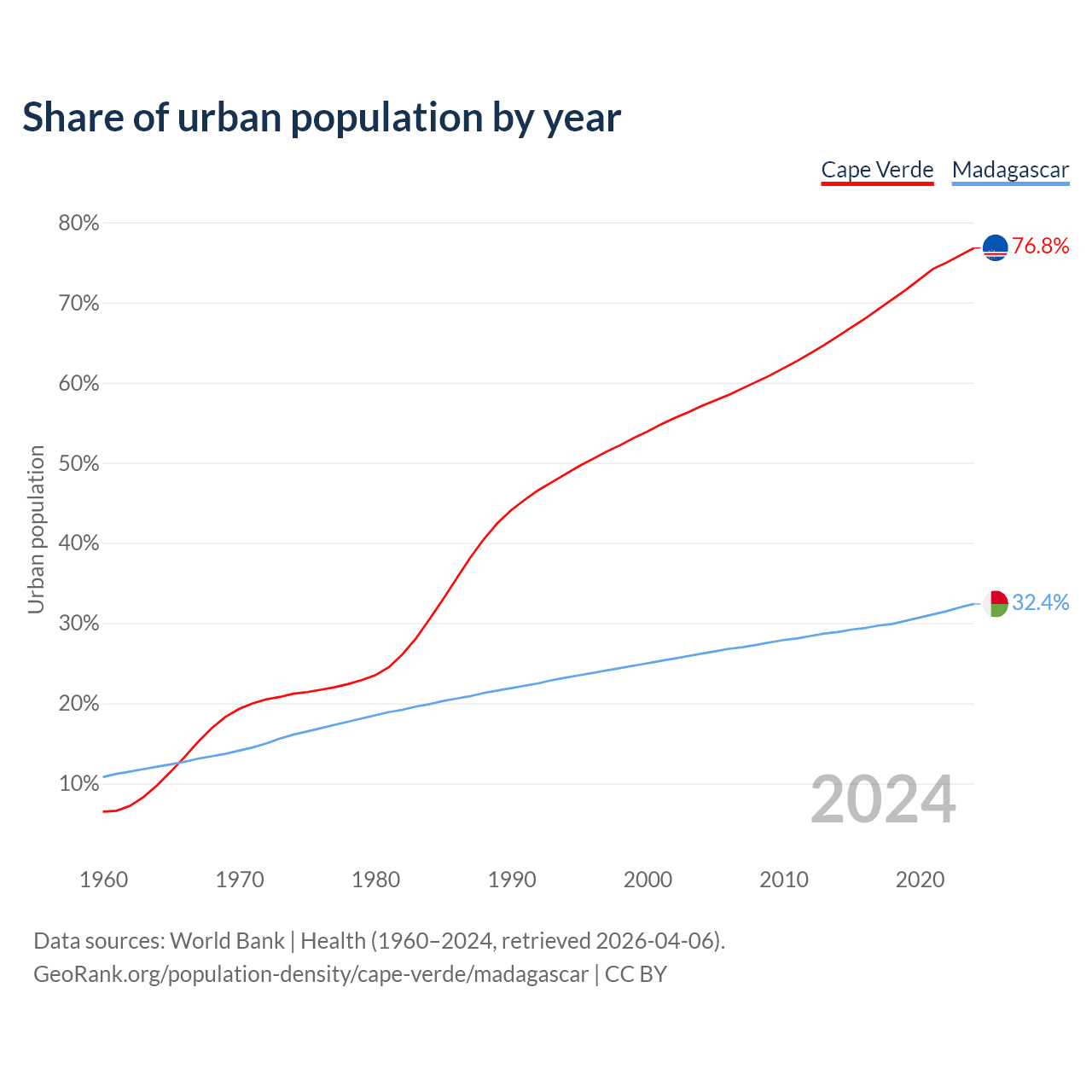 From 2004 to 2024, the share of urban population changed from 57.1% to 76.8% in Cape Verde and from 26.2% to 32.4% in Madagascar.