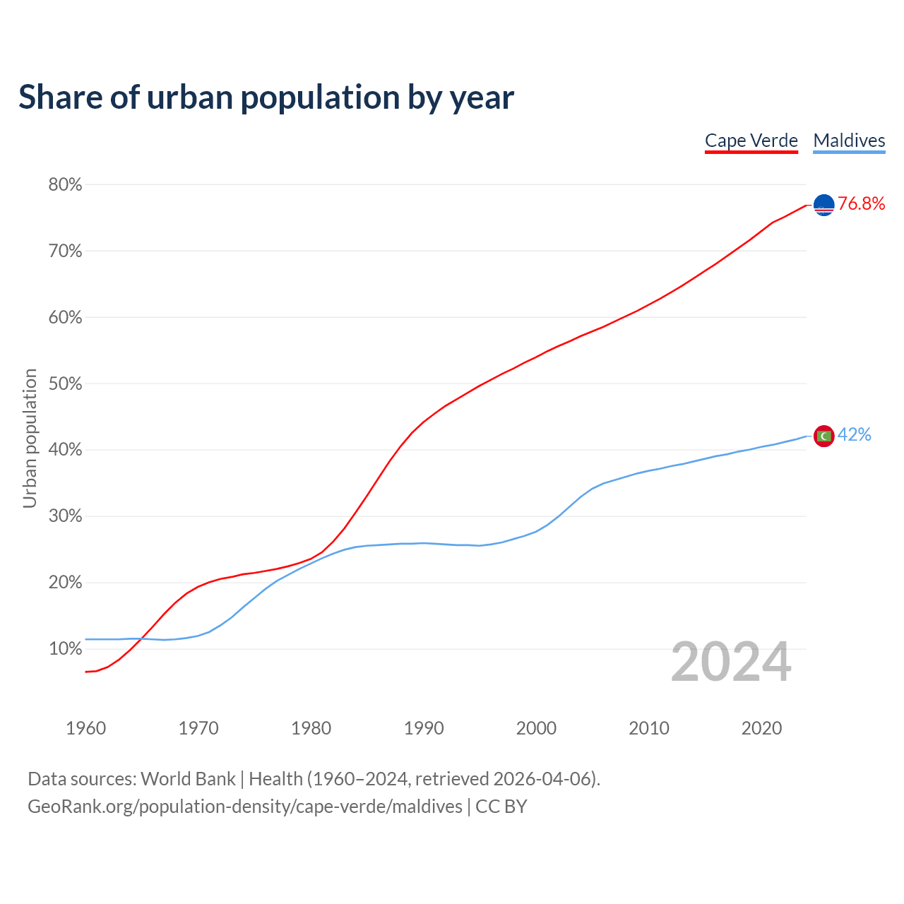 From 2004 to 2024, the share of urban population changed from 57.1% to 76.8% in Cape Verde and from 32.9% to 42% in Maldives.