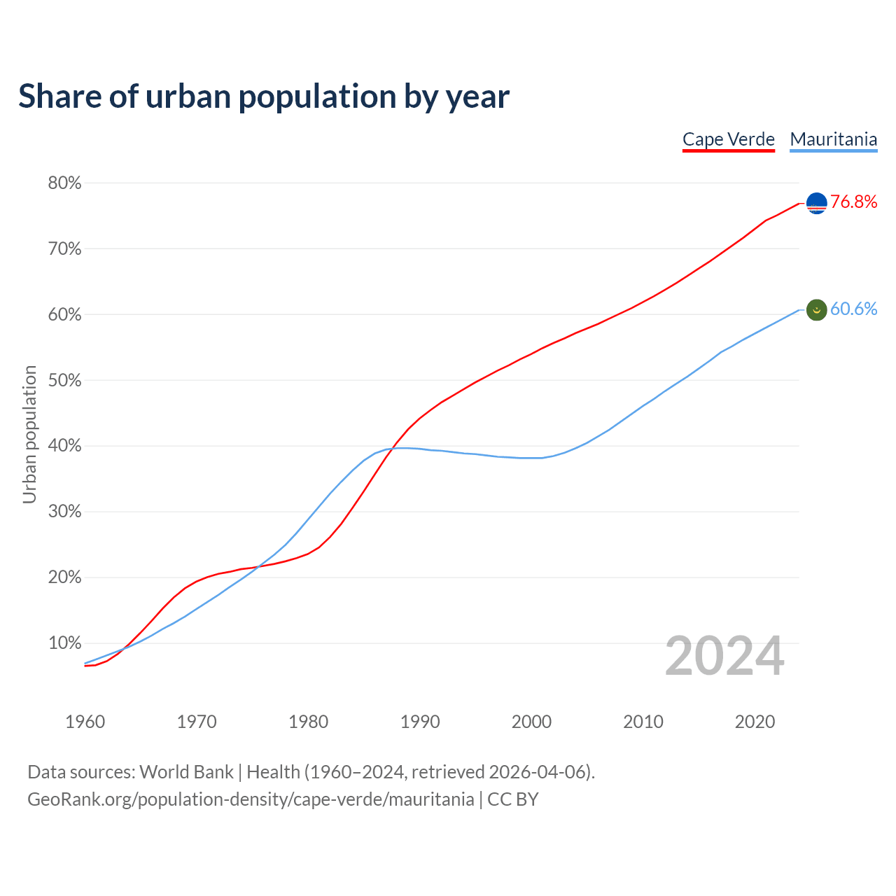From 2004 to 2024, the share of urban population changed from 57.1% to 76.8% in Cape Verde and from 39.6% to 60.6% in Mauritania.