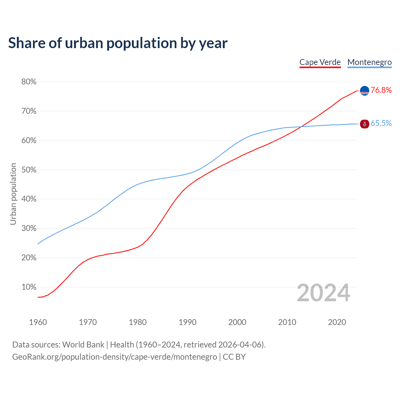 From 2004 to 2024, the share of urban population changed from 57.1% to 76.8% in Cape Verde and from 62.2% to 65.5% in Montenegro.