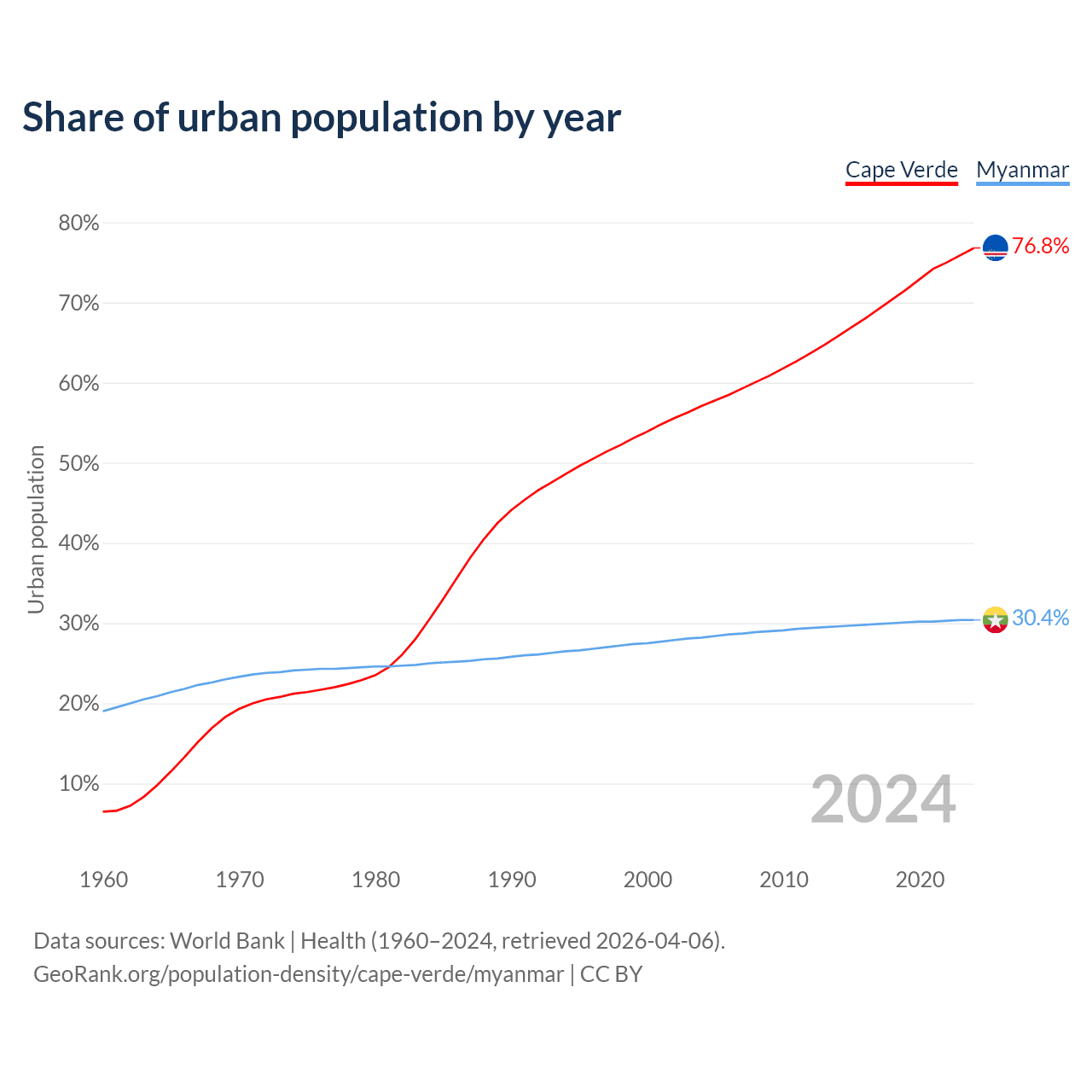 From 2004 to 2024, the share of urban population changed from 57.1% to 76.8% in Cape Verde and from 28.2% to 30.4% in Myanmar.