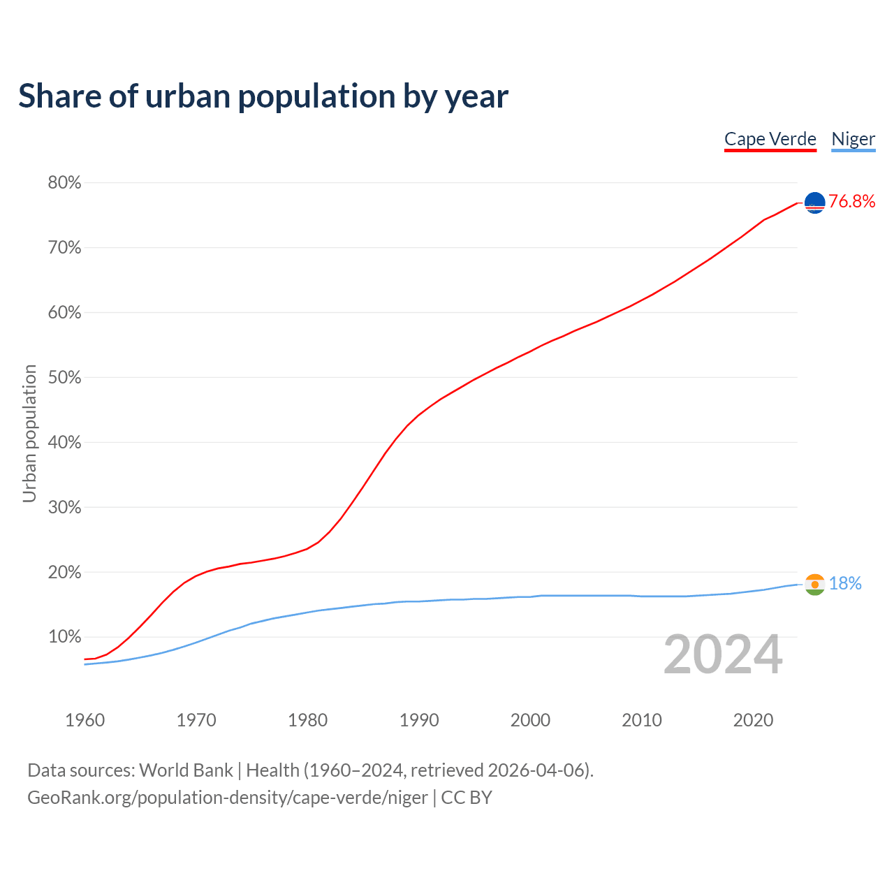 From 2004 to 2024, the share of urban population changed from 57.1% to 76.8% in Cape Verde and from 16.3% to 18% in Niger.