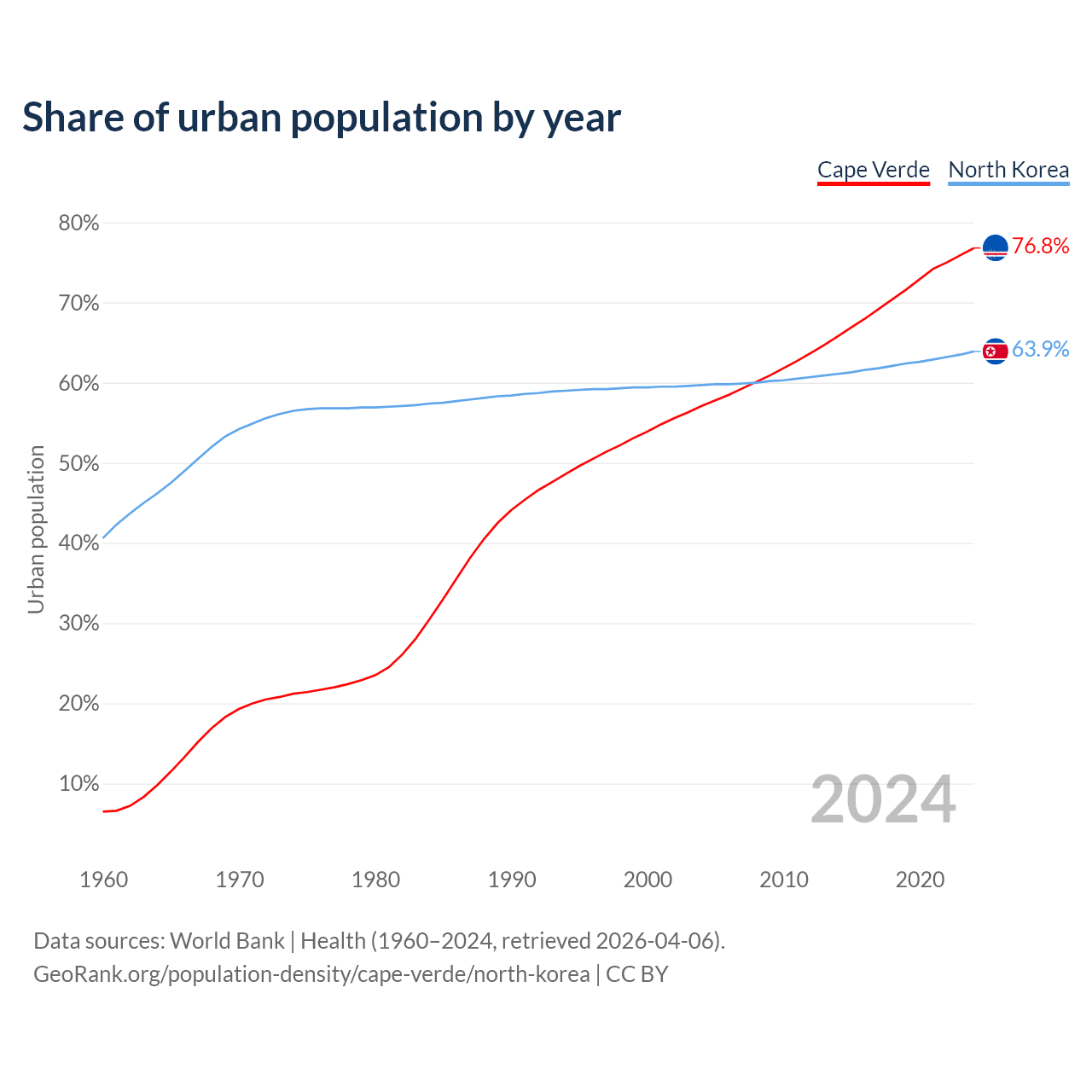 From 2004 to 2024, the share of urban population changed from 57.1% to 76.8% in Cape Verde and from 59.7% to 63.9% in North Korea.