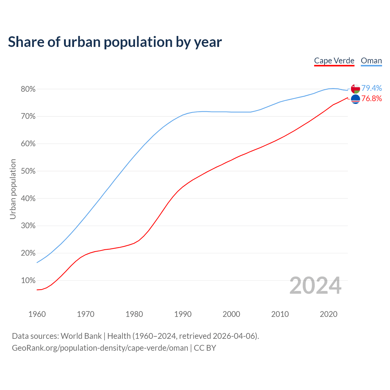 From 2004 to 2024, the share of urban population changed from 57.1% to 76.8% in Cape Verde and from 71.5% to 79.4% in Oman.