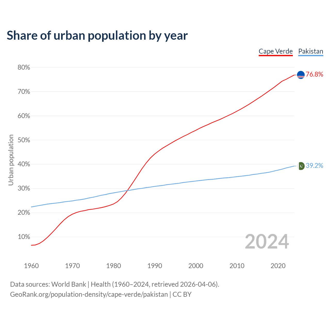 From 2004 to 2024, the share of urban population changed from 57.1% to 76.8% in Cape Verde and from 33.7% to 39.2% in Pakistan.