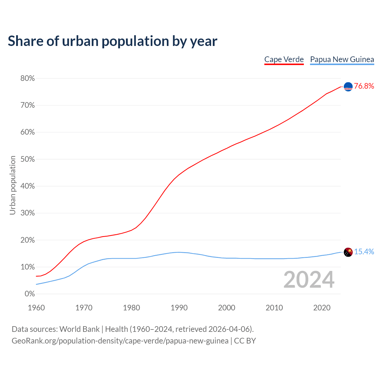 From 2004 to 2024, the share of urban population changed from 57.1% to 76.8% in Cape Verde and from 13.1% to 15.4% in Papua New Guinea.