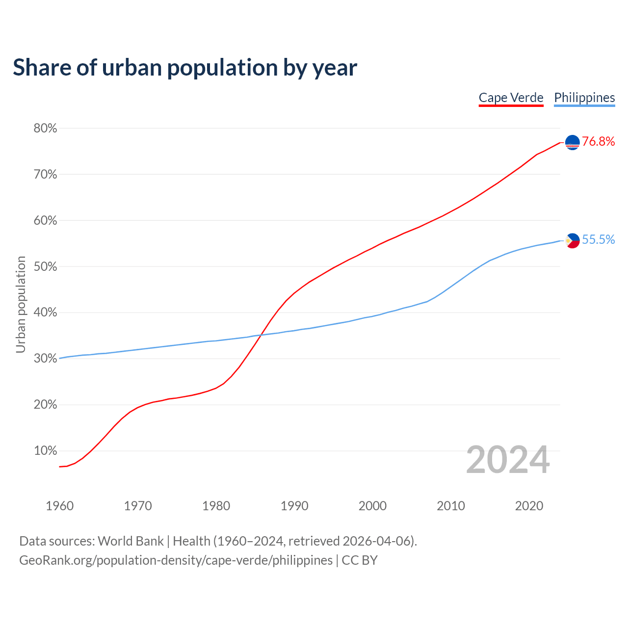 From 2004 to 2024, the share of urban population changed from 57.1% to 76.8% in Cape Verde and from 40.9% to 55.5% in the Philippines.