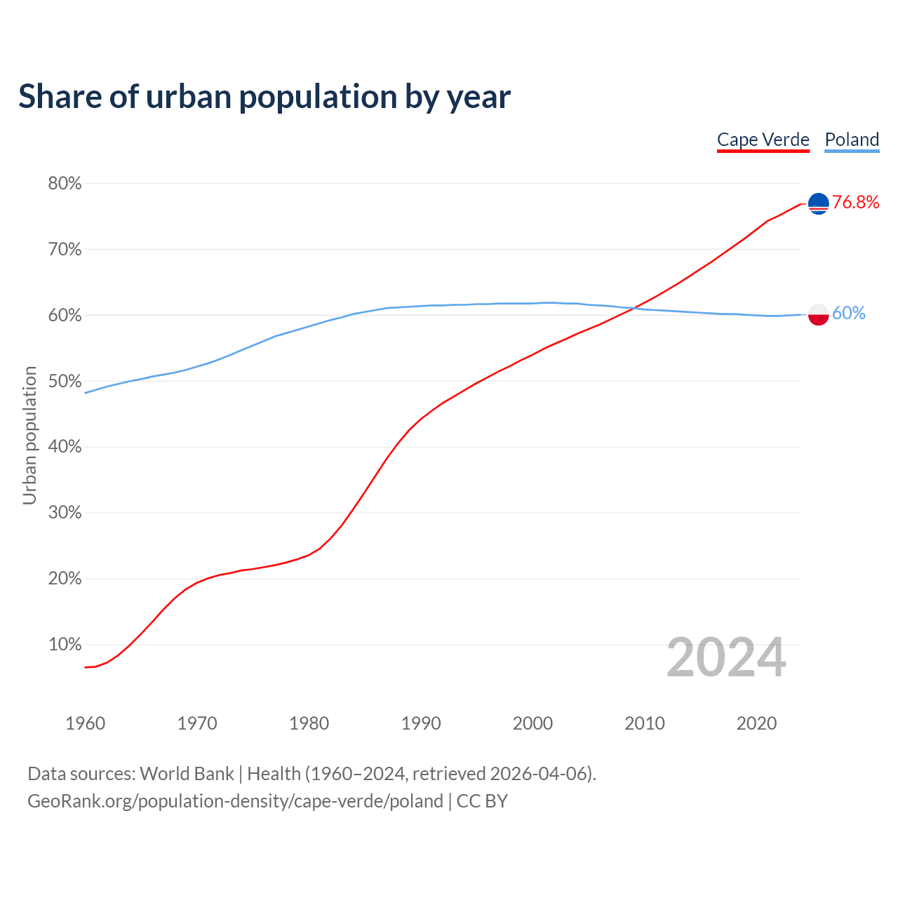 From 2004 to 2024, the share of urban population changed from 57.1% to 76.8% in Cape Verde and from 61.7% to 60% in Poland.