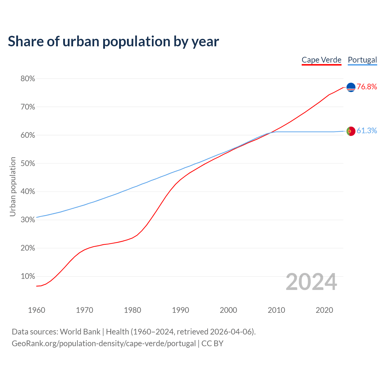 From 2004 to 2024, the share of urban population changed from 57.1% to 76.8% in Cape Verde and from 57.4% to 61.3% in Portugal.