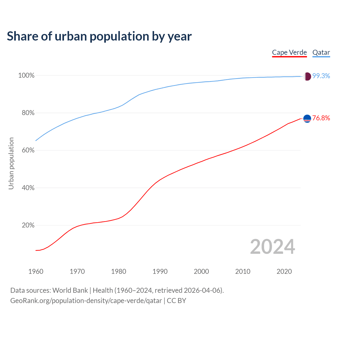 From 2004 to 2024, the share of urban population changed from 57.1% to 76.8% in Cape Verde and from 97% to 99.3% in Qatar.