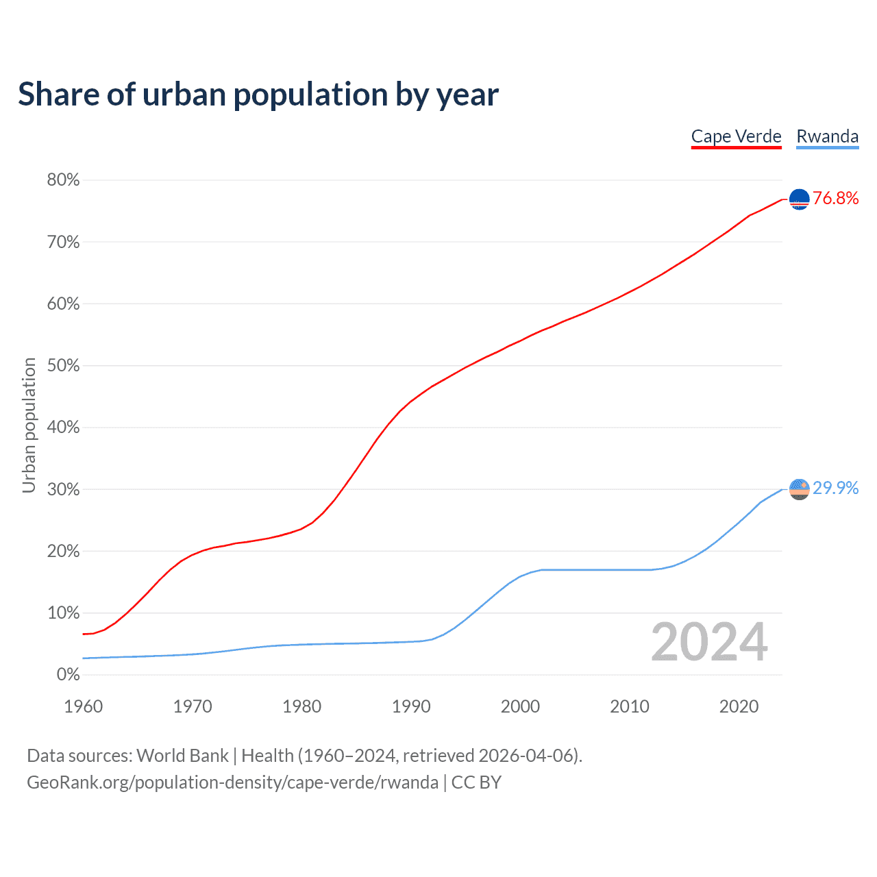 From 2004 to 2024, the share of urban population changed from 57.1% to 76.8% in Cape Verde and from 16.9% to 29.9% in Rwanda.