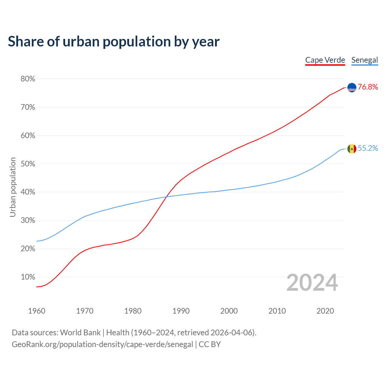 From 2004 to 2024, the share of urban population changed from 57.1% to 76.8% in Cape Verde and from 41.6% to 55.2% in Senegal.