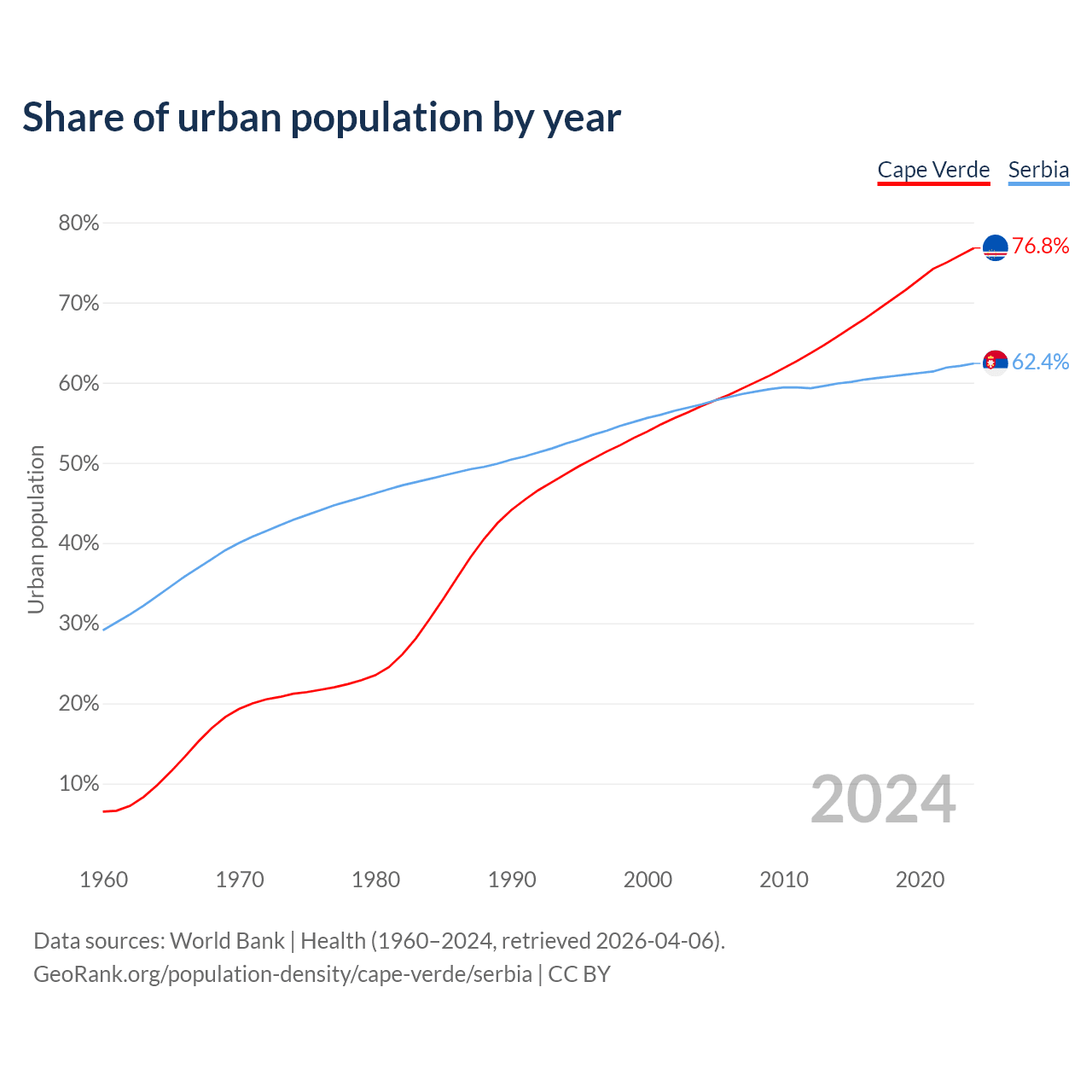 From 2004 to 2024, the share of urban population changed from 57.1% to 76.8% in Cape Verde and from 57.3% to 62.4% in Serbia.
