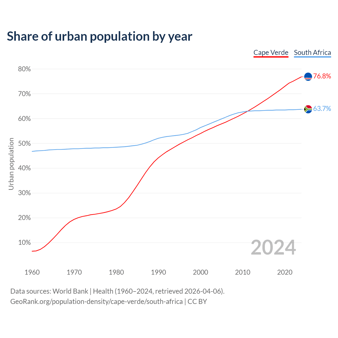 From 2004 to 2024, the share of urban population changed from 57.1% to 76.8% in Cape Verde and from 59.1% to 63.7% in South Africa.