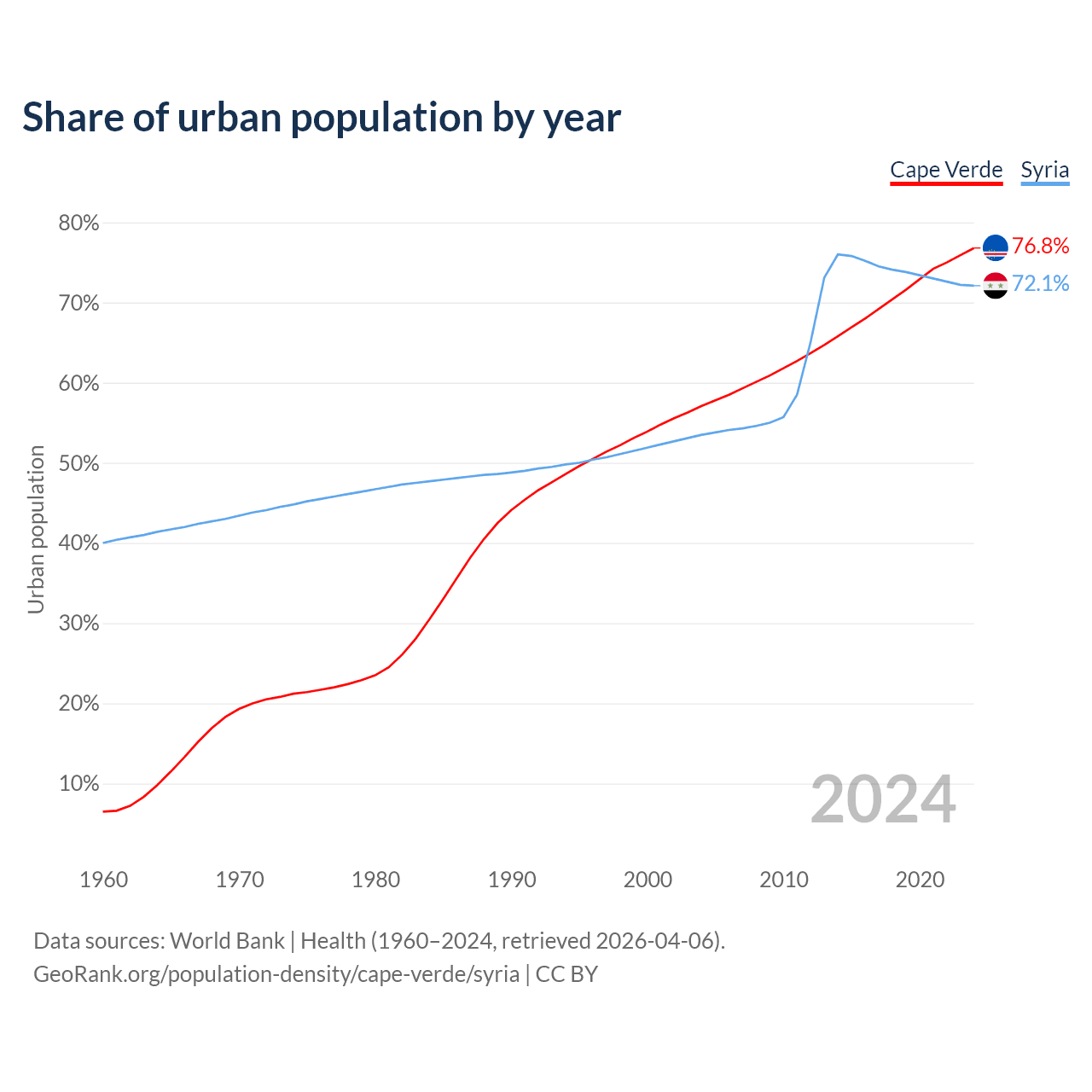 From 2004 to 2024, the share of urban population changed from 57.1% to 76.8% in Cape Verde and from 53.5% to 72.1% in Syria.