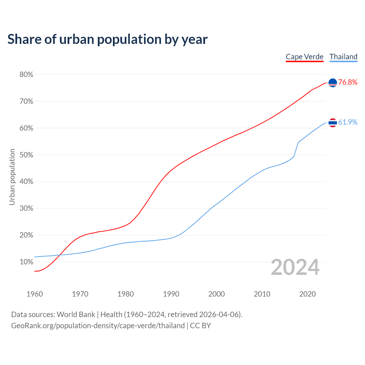 From 2004 to 2024, the share of urban population changed from 57.1% to 76.8% in Cape Verde and from 36.8% to 61.9% in Thailand.