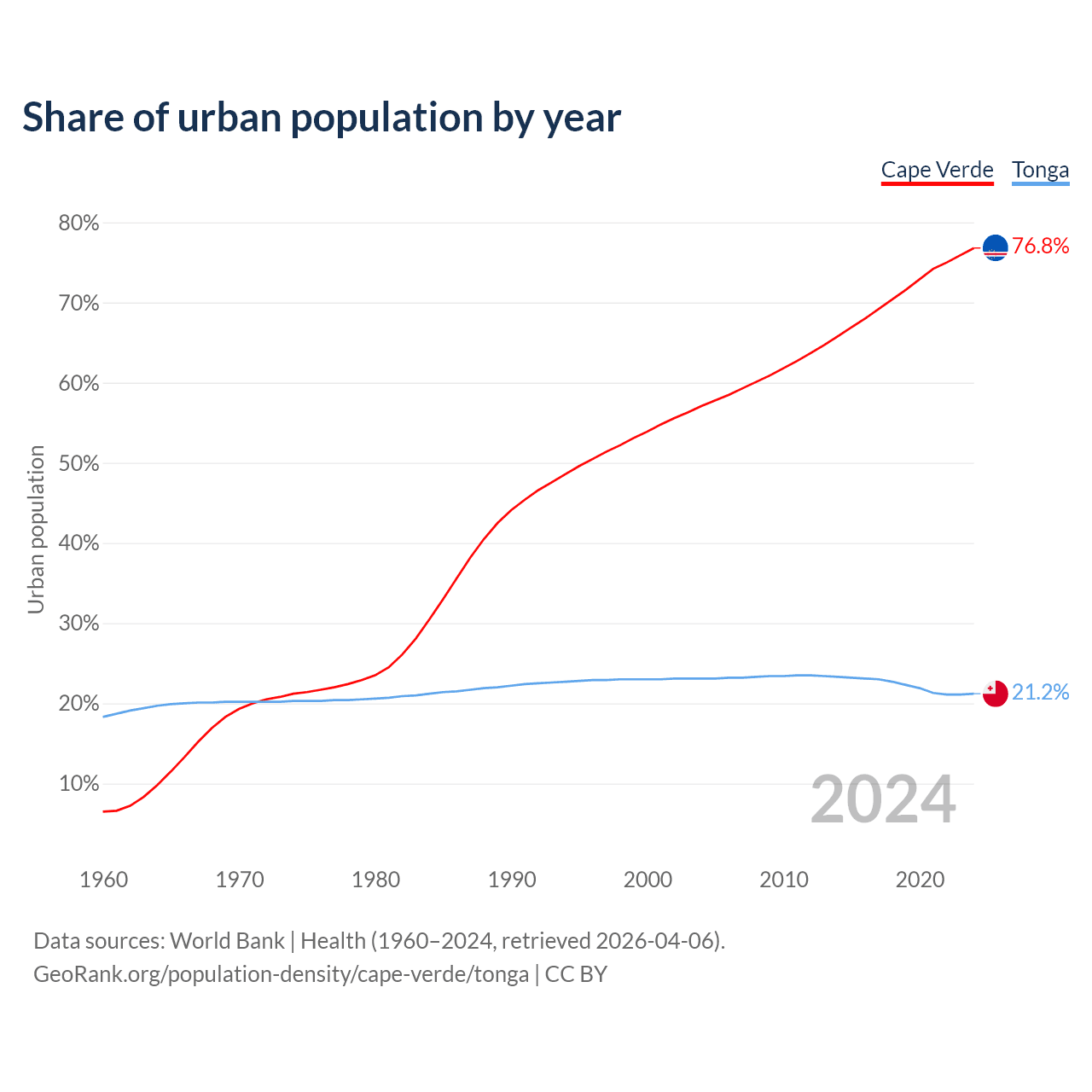 From 2004 to 2024, the share of urban population changed from 57.1% to 76.8% in Cape Verde and from 23.1% to 21.2% in Tonga.