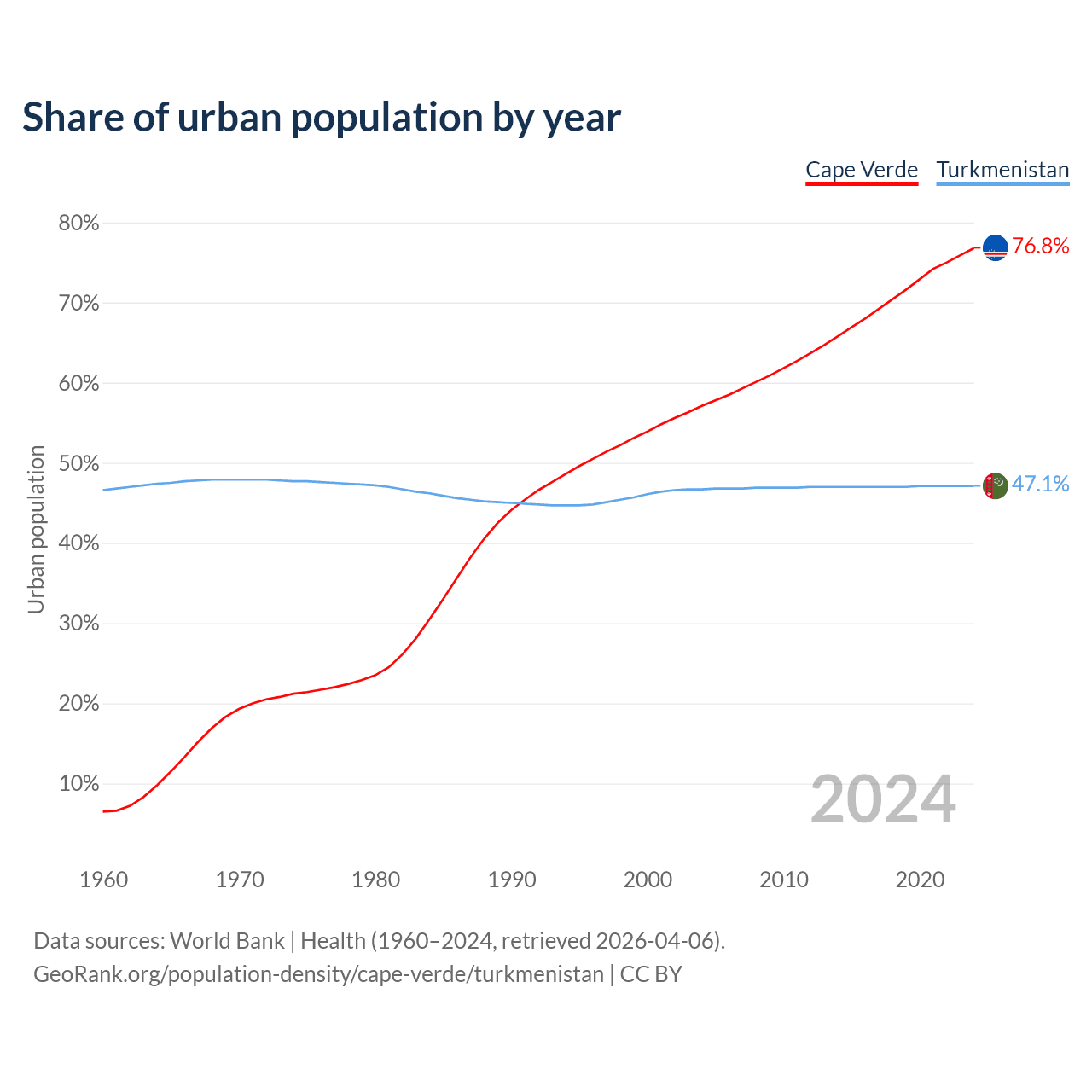 From 2004 to 2024, the share of urban population changed from 57.1% to 76.8% in Cape Verde and from 46.7% to 47.1% in Turkmenistan.