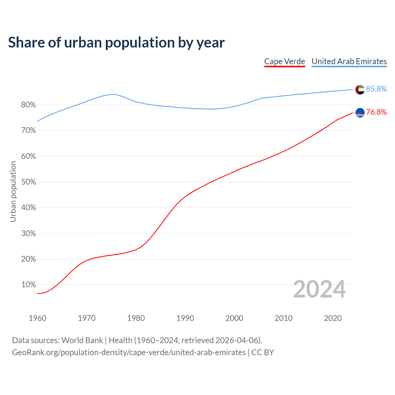From 2004 to 2024, the share of urban population changed from 57.1% to 76.8% in Cape Verde and from 81.5% to 85.8% in the United Arab Emirates.