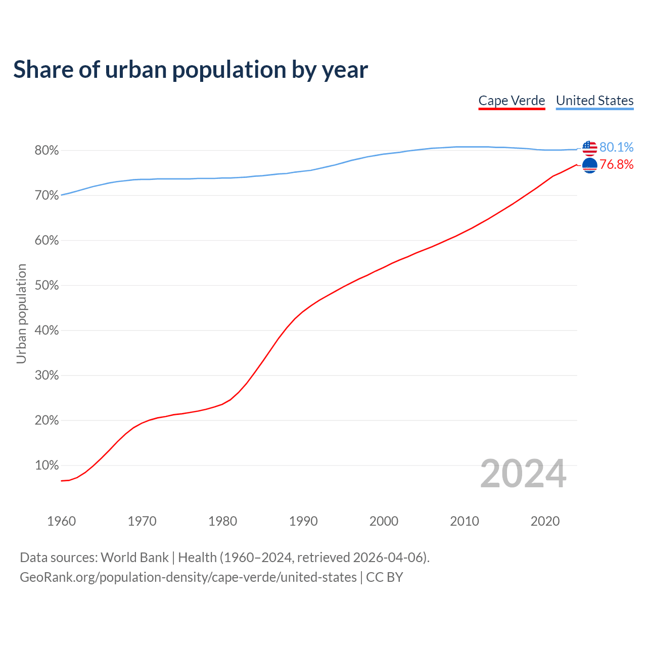 From 2004 to 2024, the share of urban population changed from 57.1% to 76.8% in Cape Verde and from 80% to 80.1% in the United States.