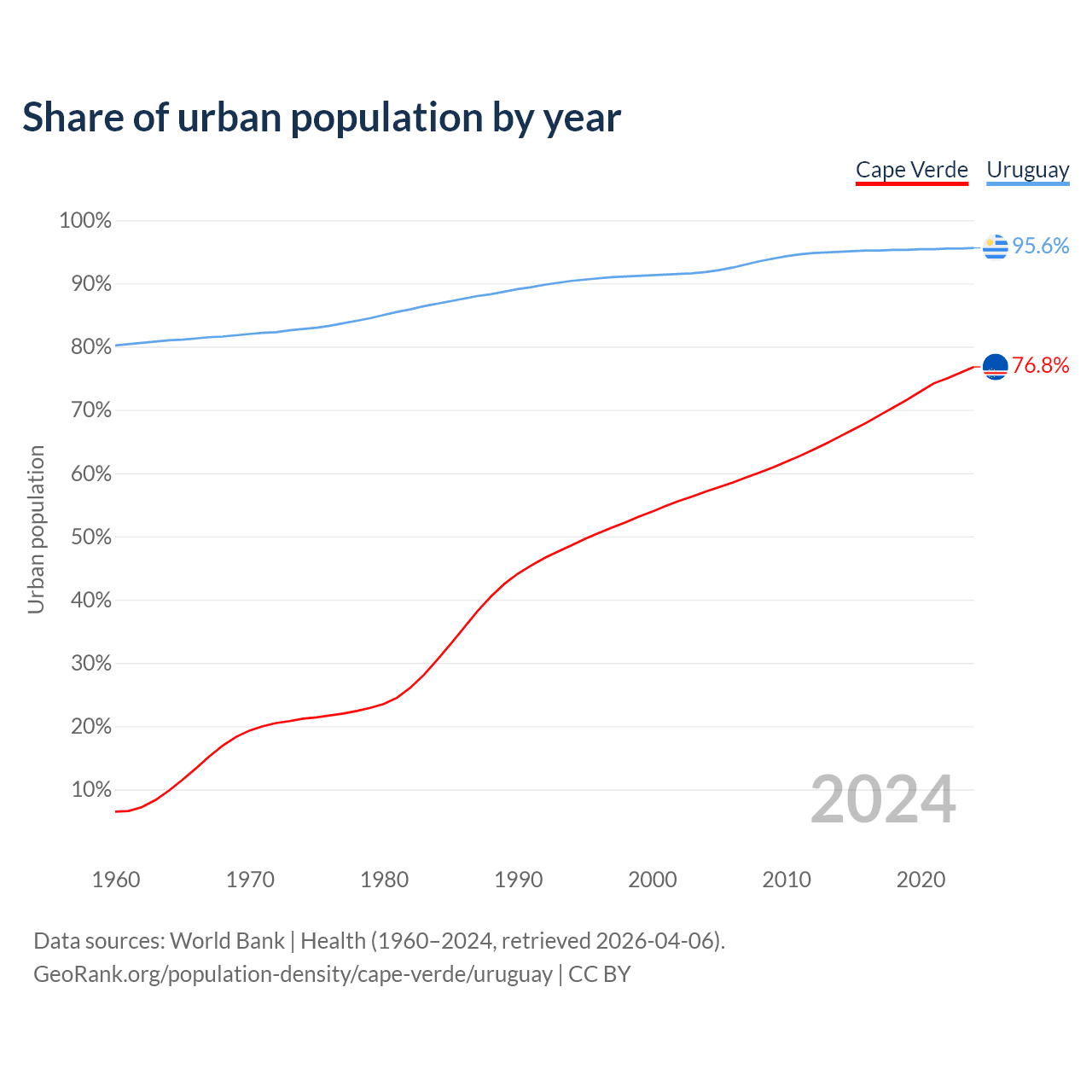 From 2004 to 2024, the share of urban population changed from 57.1% to 76.8% in Cape Verde and from 91.8% to 95.6% in Uruguay.