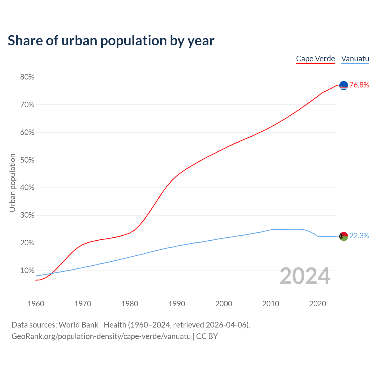 From 2004 to 2024, the share of urban population changed from 57.1% to 76.8% in Cape Verde and from 22.7% to 22.3% in Vanuatu.