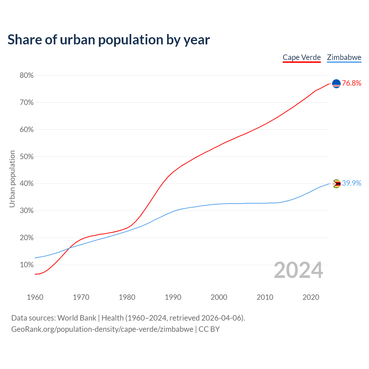 From 2004 to 2024, the share of urban population changed from 57.1% to 76.8% in Cape Verde and from 32.6% to 39.9% in Zimbabwe.