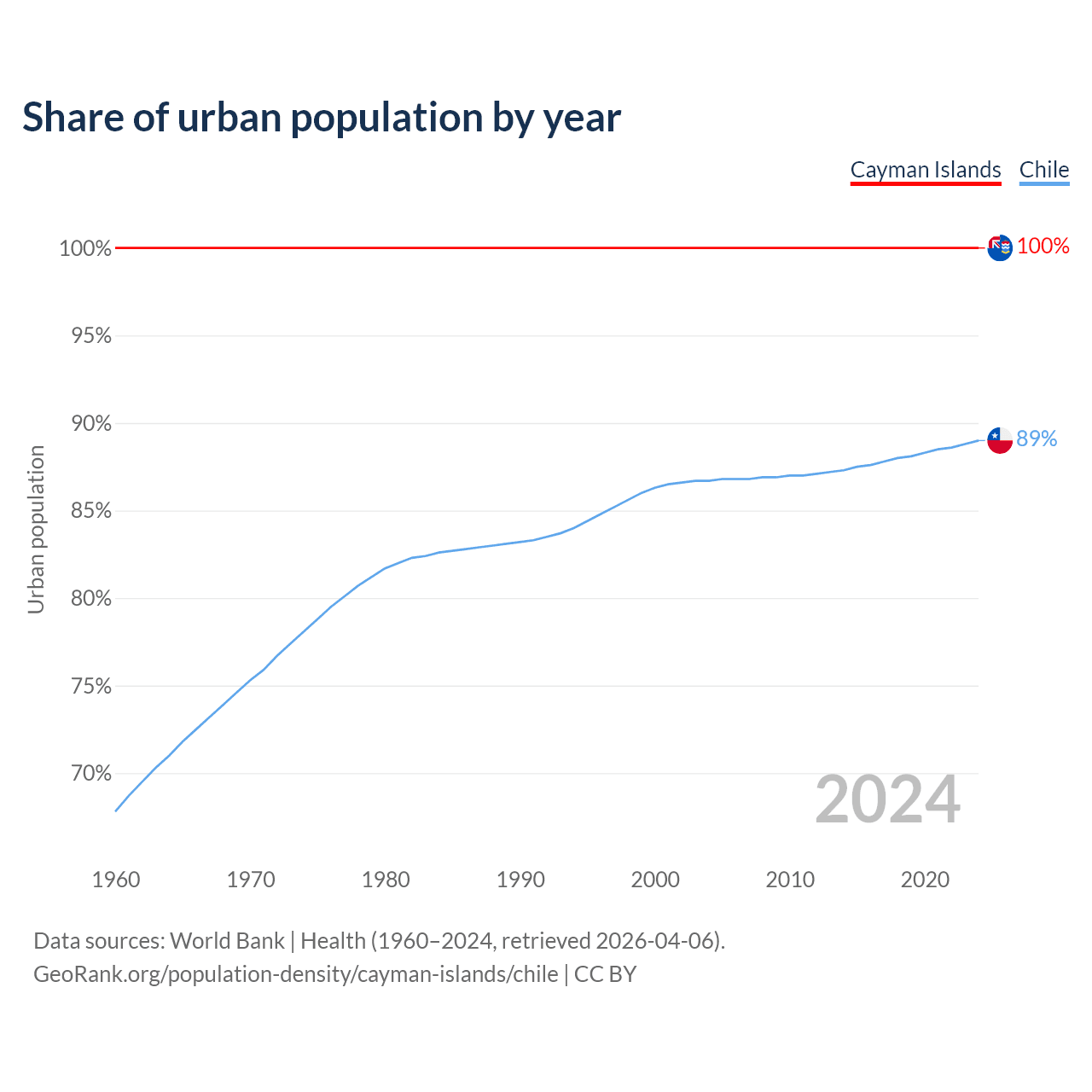 From 2004 to 2024, the share of urban population changed from 100% to 100% in the Cayman Islands and from 86.7% to 89% in Chile.