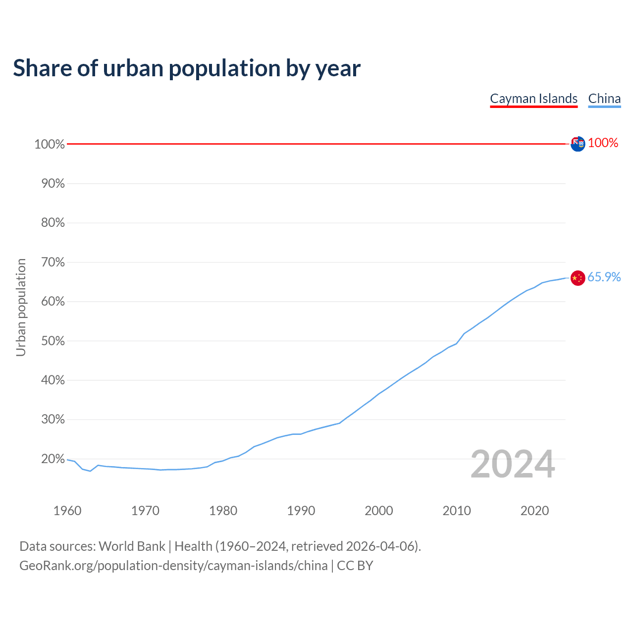 From 2004 to 2024, the share of urban population changed from 100% to 100% in the Cayman Islands and from 41.8% to 65.9% in China.