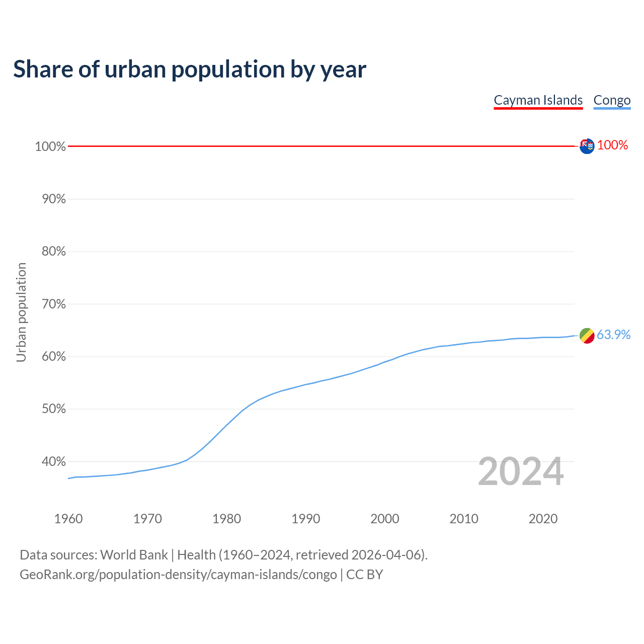 From 2004 to 2024, the share of urban population changed from 100% to 100% in the Cayman Islands and from 60.9% to 63.9% in the Congo.