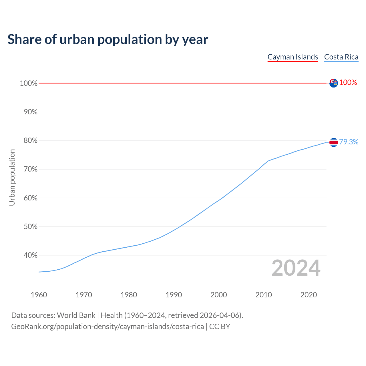 From 2004 to 2024, the share of urban population changed from 100% to 100% in the Cayman Islands and from 63.7% to 79.3% in Costa Rica.