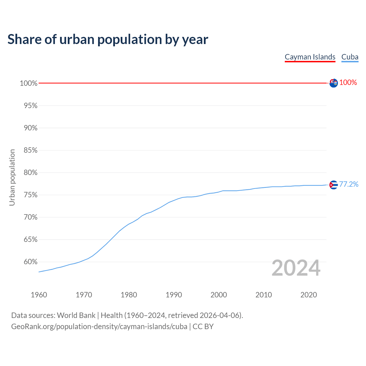 From 2004 to 2024, the share of urban population changed from 100% to 100% in the Cayman Islands and from 75.9% to 77.2% in Cuba.