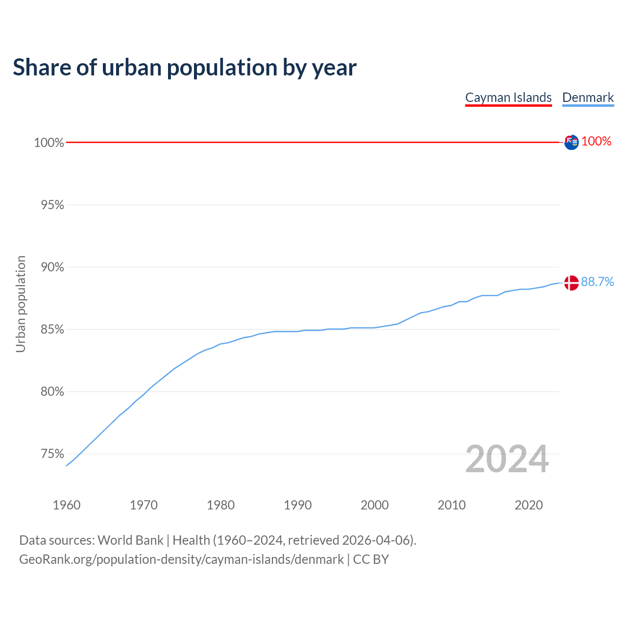 From 2004 to 2024, the share of urban population changed from 100% to 100% in the Cayman Islands and from 85.7% to 88.7% in Denmark.